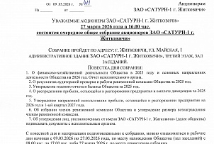 Акционерам ЗАО САТУРН-1 г. Житковичи о проведении 21.03.2025 годАкционерам ЗАО САТУРН-1 г. Житковичи о проведении 21032025 года очередного общего собрания акционерова очередного общего собрания акционеров