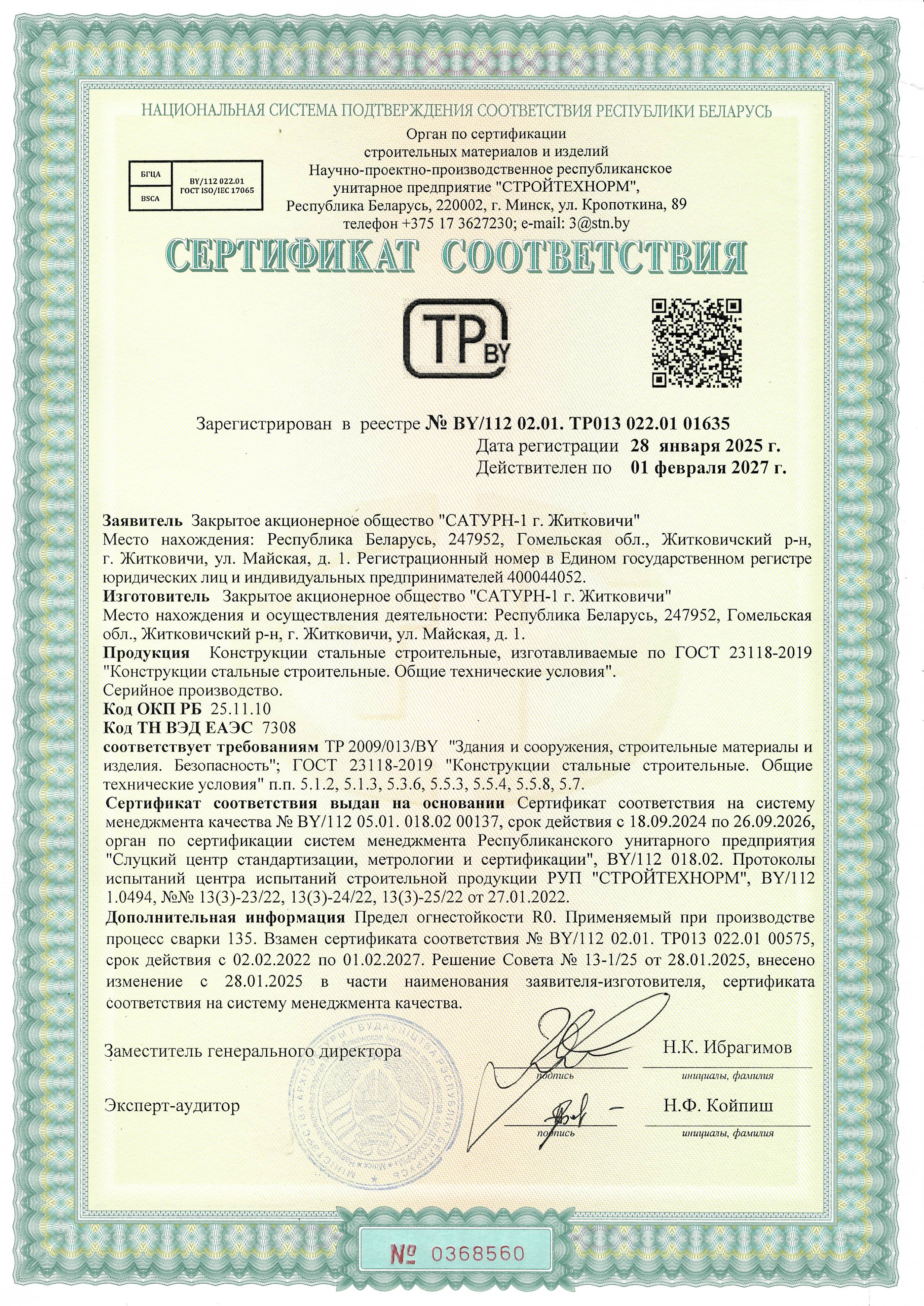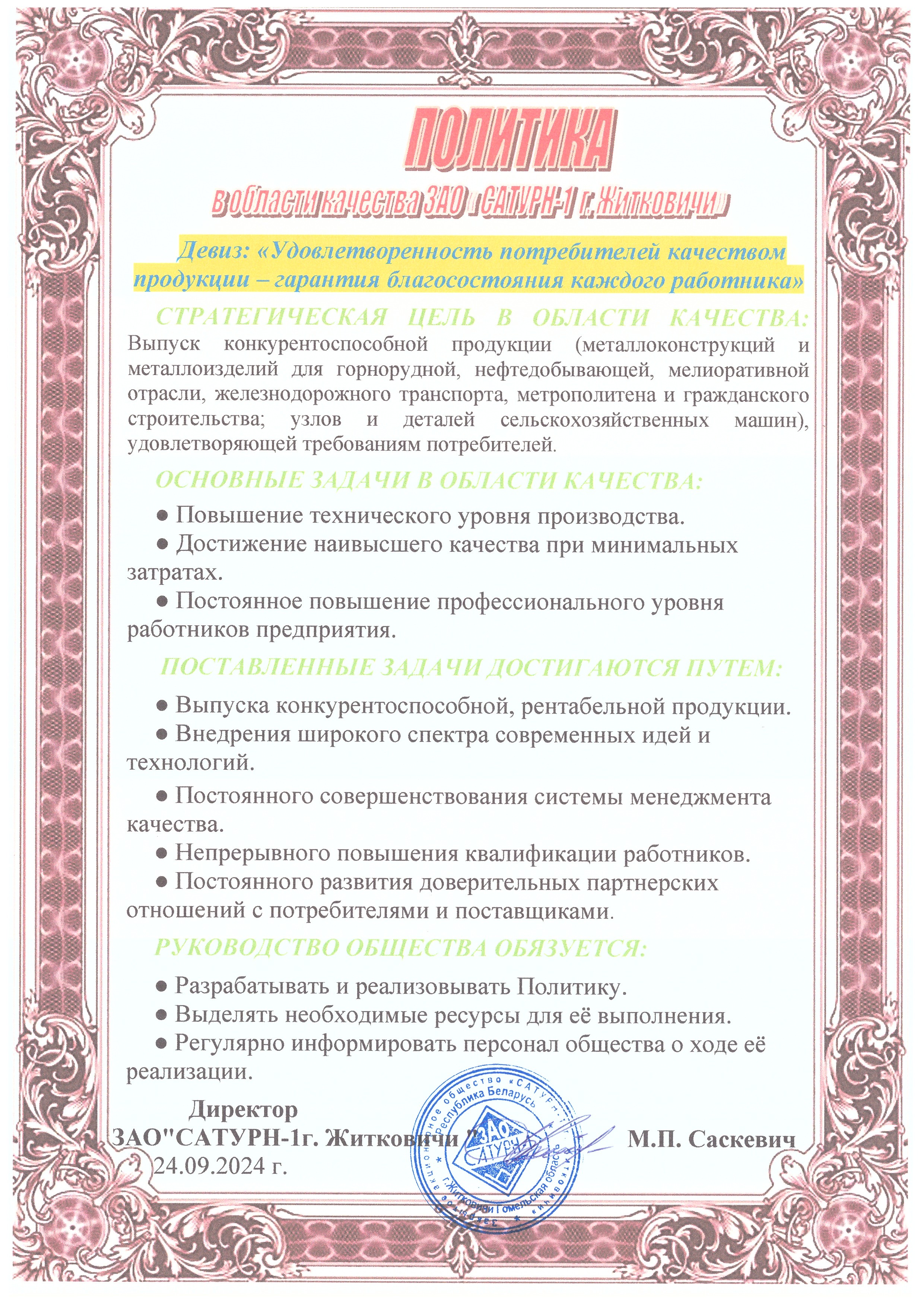33 лет безупречной работы - это показатель стабильности и высокого качества реализуемых проектов в области производства металлоконструкций и металлоизделий. Совершенствование и развитие технологических процессов является конкурентным преимуществом завода ЗАО «САТУРН-1 г. Житковичи».