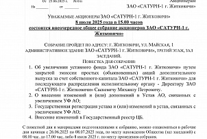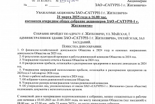 Акционерам ЗАО САТУРН-1 г. Житковичи о проведении 21.03.2025 годАкционерам ЗАО САТУРН-1 г. Житковичи о проведении 21032025 года очередного общего собрания акционерова очередного общего собрания акционеров