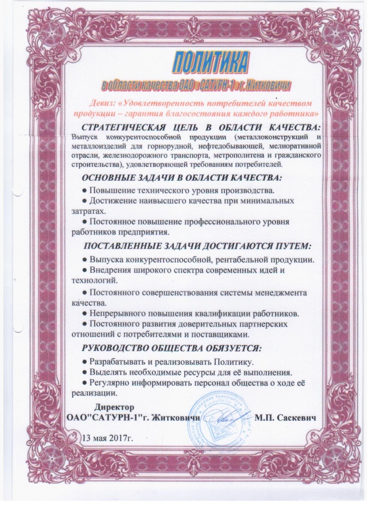 Политика в области качества ЗАО «САТУРН-1 г. Житковичи»