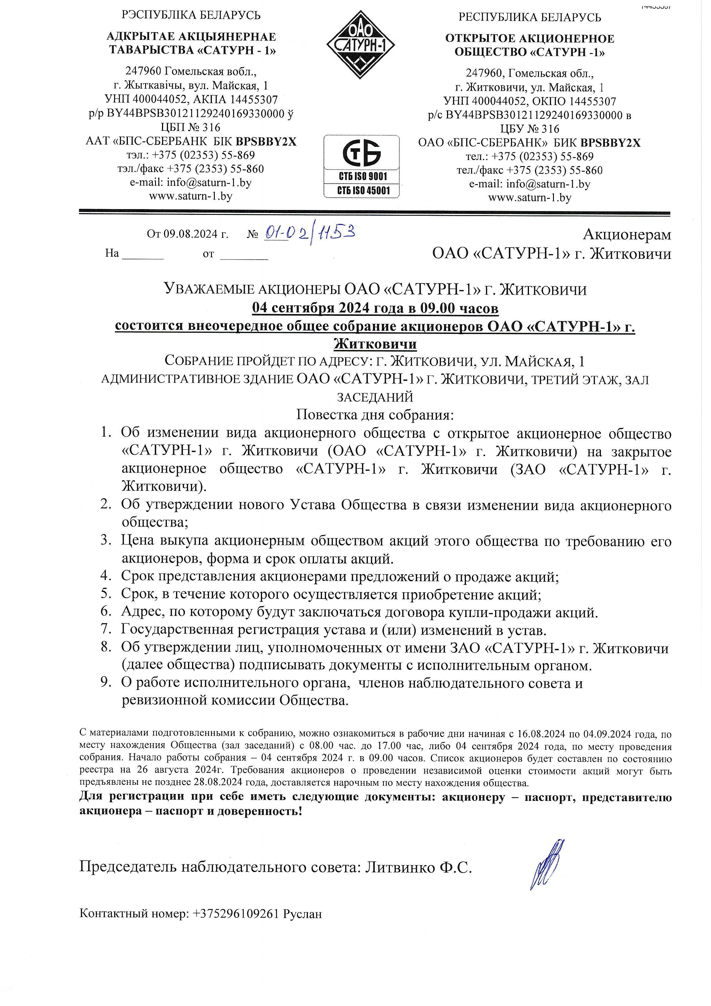 Акционерам ЗАО САТУРН-1 г. Житковичи о проведении 21032025 года очередного общего собрания акционеровАкционерам ЗАО САТУРН-1 г. Житковичи о проведении 21.03.2025 годАкционерам ЗАО САТУРН-1 г. Житковичи о проведении 21032025 года очередного общего собрания акционерова очередного общего собрания акционеровчитать полностью -