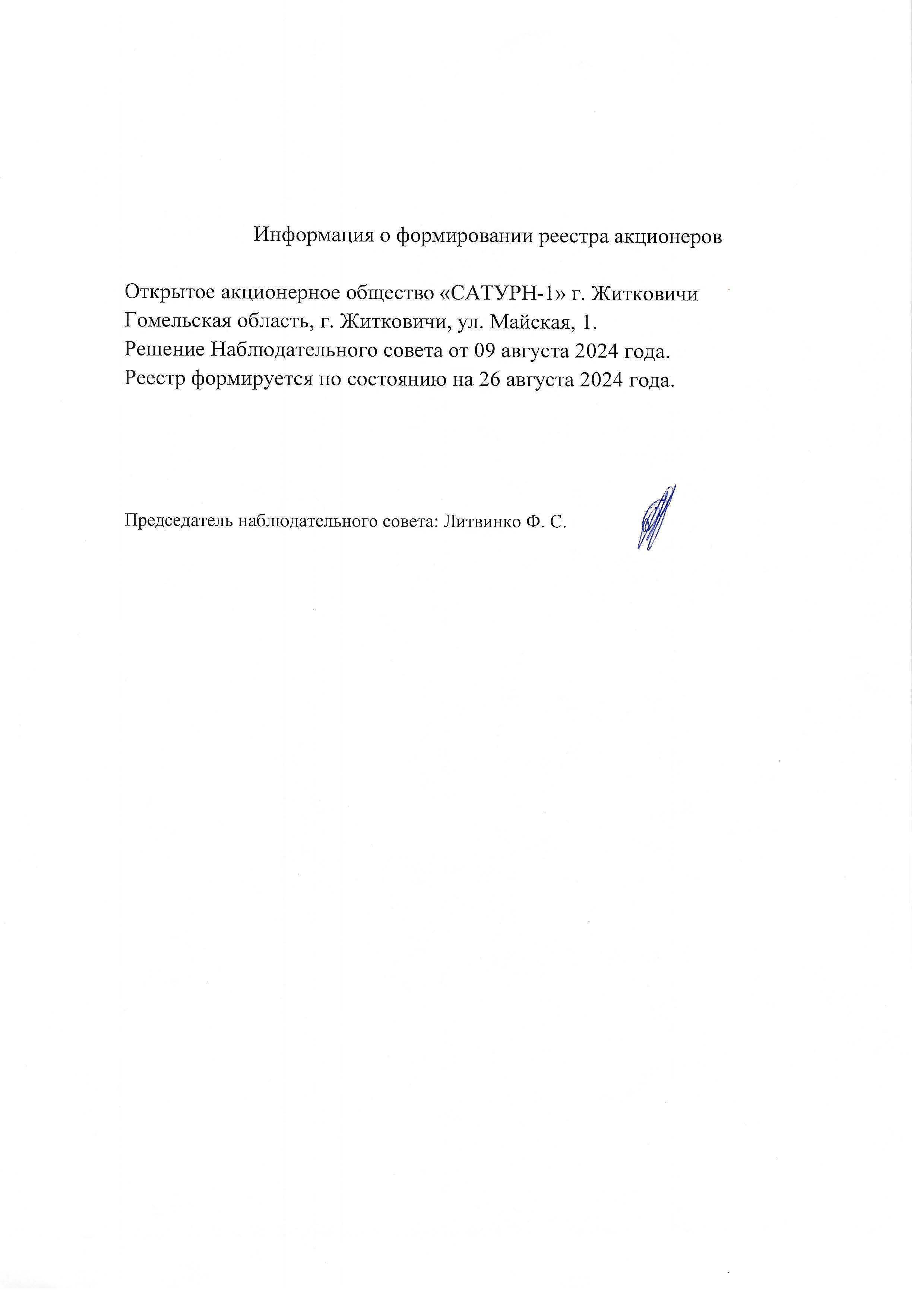 Уведомление о формировании реестра акционеров ОАО САТУРН-1 -