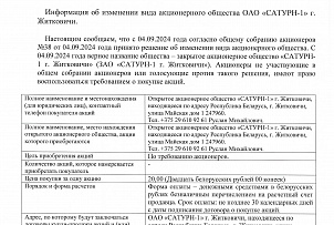 Уведомление Акционерам ОАО САТУРН-1 г. Житковичи об изменении вида акционерного общества -