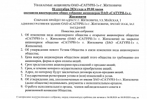 Уведомление акционерам о внеочередном собрании акционеров ОАО САТУРН-1 -